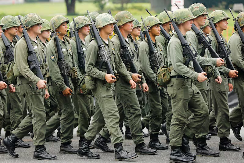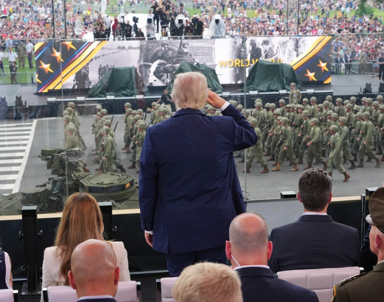 In Trump’s parade there were men and women who would have rather been anywhere else but here. It was Sunday and Father’s Day and here they were ambling along, out of step, being forced to salute an individual who had avoided military service and present him with a folded national flag as a gift he had purchased for himself with their money.