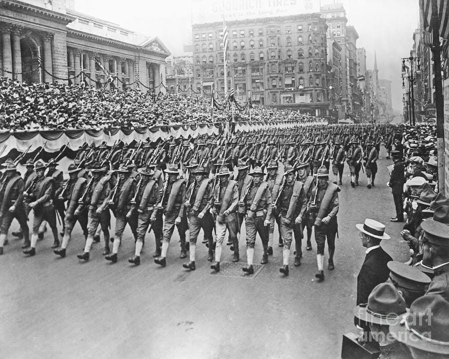 Up on the risers and in the windows thousands cheers and clap. The old recall days when they had their parades, the mothers weep as they watch their offspring march before them and remember them as babies. The children wish they were soldiers. One day they want to be out there protecting the people, making them safe, wearing those uniforms, and being held up as the epitome of everything worthwhile.